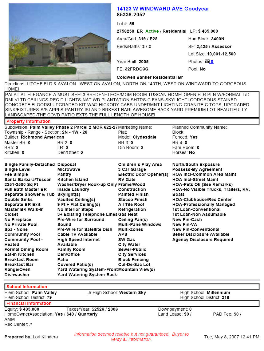 Coldwell Banker Residential Brokerage eMail Linda L. Lightfoot, Managing Broker 3050 W Agua Fria Freeway, Suite 110 Phoenix, AZ 85051 eMail Lori Klindera or G-II Varrato II More ways to contact Lori Klindera O: (623) 344-4000 C: (602) 574-5674 F: (602) 296-0124 C: (602) 796-5674 |